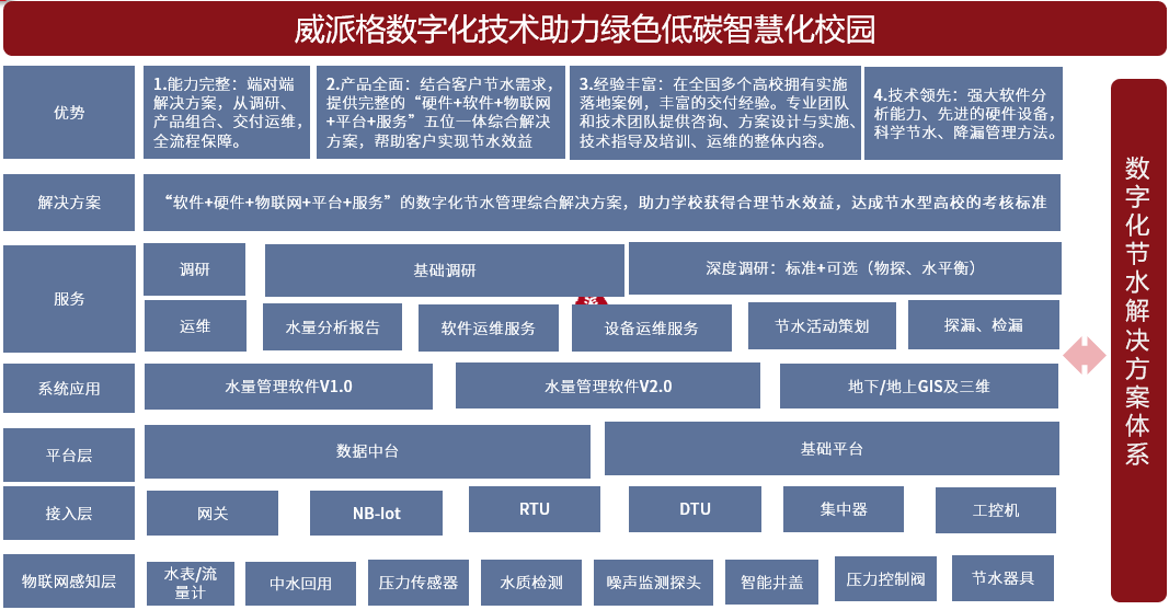 威派格積極響應國家政策,為加快國家節水行動政策的快速落地建言獻策。針對高校用水現狀,依據節水型高校建設標準,我們結合多年的水務運行管理經驗與高校應用場景打造數字化節水解決方案,主要通過以下幾個方面的建設來實現校園的節水目標: