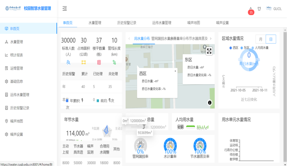 其次對校園管網進行實時在線用水監測、水量平衡管理、流量監控,壓力監控和管網漏損監控;增強高校用水精細化管理能力,通過比對各級水量差值,同時針對性分析評估各級水量自身用水特征和用水屬性的匹配情況,及時發現各級供水管線存在和新增的漏損,支撐日常監測與維護工作,降低生均用水量。項目建成后生均用水量從62m3/a降低至22m3/a,低于水利部高校人均用水定額先進33m3/a。