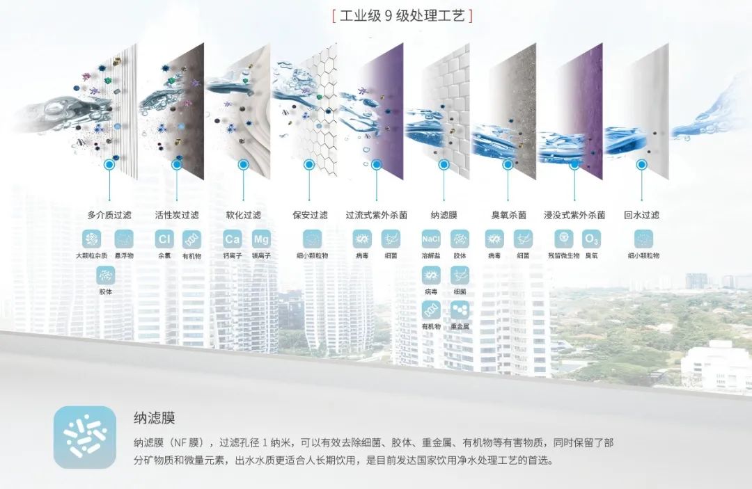 系統采用“多介質過濾-活性炭過濾-軟化過濾-保安過濾-過流式紫外殺菌-納濾過濾-臭氧殺菌-浸沒式紫外殺菌-回水過濾”九級處理工藝,去除水中雜質、鐵銹、異味、細菌、微生物、重金屬等有害污染物,保證水質達到“飲用凈水水質標準CJ94-2005”的直飲要求,適合家中飲用、煮飯、洗菜、泡茶等多種需要。