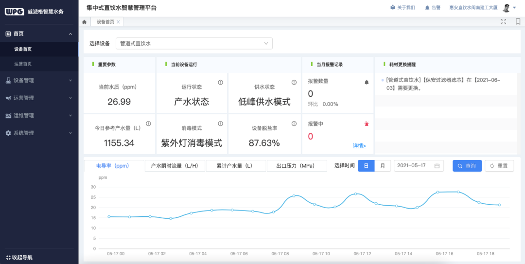 利用互聯網技術搭建優質水管理平臺,為用戶提供全生命周期的運維服務。將設備的運行數據和泵房視頻圖像遠程傳輸到公司管理平臺,實現24小時遠程監控,管理者可以實現更好的設備管理和運營管理,及時了解設備運營情況,保障安全優質供水。用戶也可通過手機端隨時查詢水質狀況、濾芯使用壽命等,管理更加高效智能、專業科學。