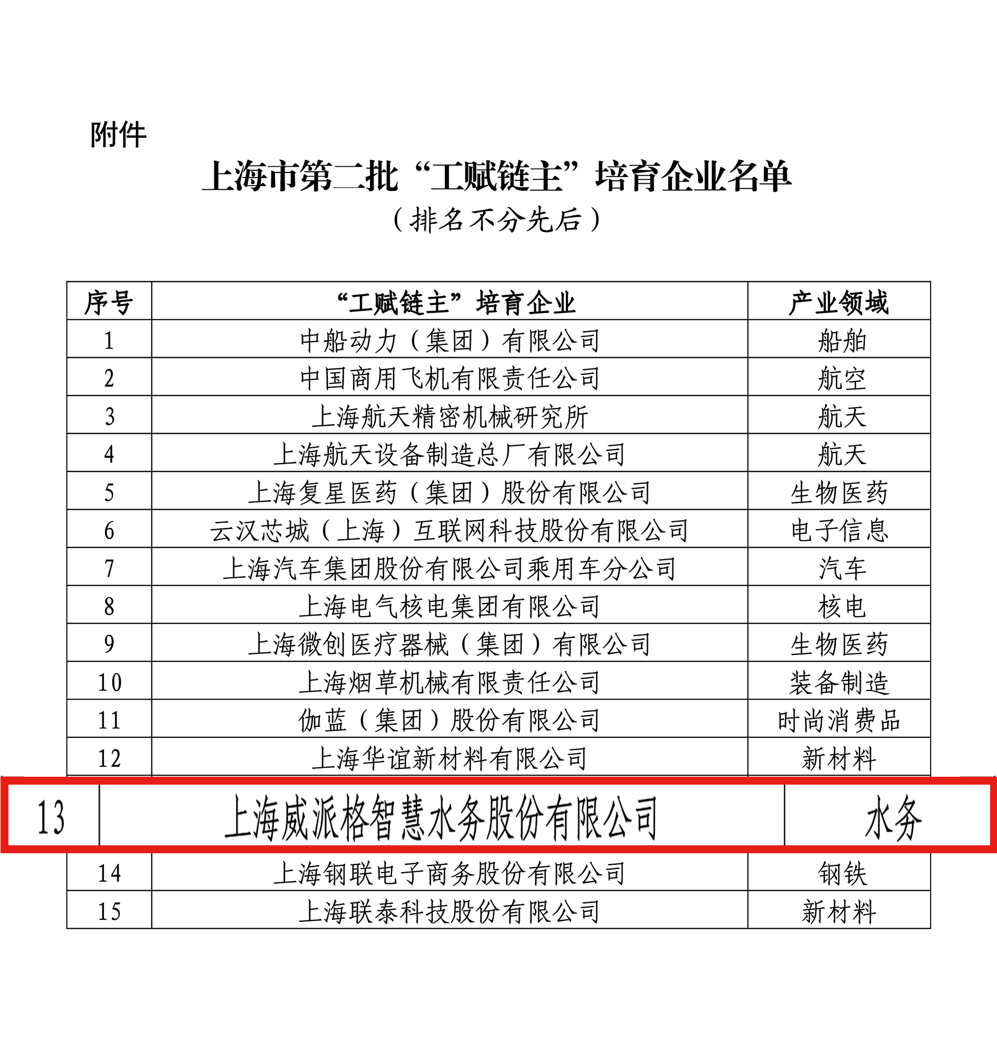 為落實《上海市制造業數字化轉型實施方案》,上海積極推進“工賦鏈主”梯度培育工程,著力打造一批制造業數字化轉型標桿,以數字化提升重點產業鏈、供應鏈的競爭力和韌性,帶動產業鏈上下游發展。上海市經濟信息化委公布上海市第二批“工賦鏈主”培育企業名單,上海威派格智慧水務股份有限公司(以下簡稱“威派格”)成功入選。